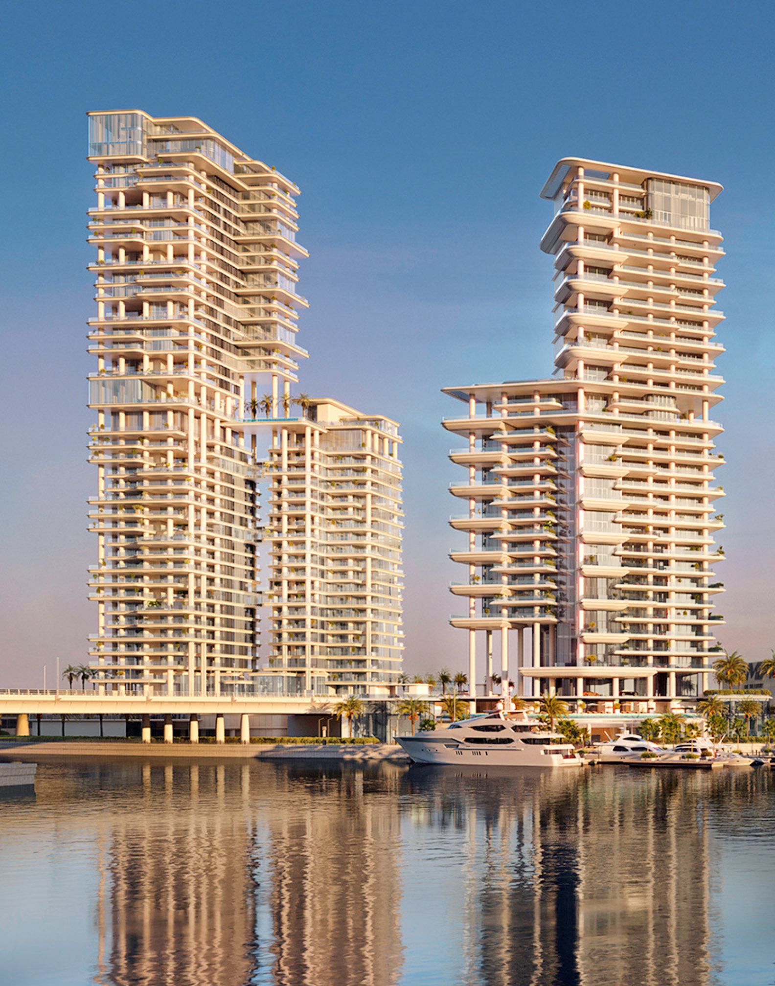 Vela Viento is a unique luxury development by Omniyat, located in the prestigious Business Bay district along the Dubai Water Canal. Designed by Foster + Partners, the building features a distinctive "dancing" form with curved lines, horizontal accents, and multi-level balconies. It consists of two towers – one with 41 floors and the other with 21 floors – connected by floating bridges that serve as dining areas for the exclusive Sky Bridge Duplexes. The interior design is by Gilles & Boissier, enhancing the project's overall luxury appeal.